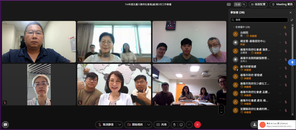 「北臺區域發展推動委員會」114年度健康社福組-社福組第1次工作會議,於114年9月18日以遠距視訊方式辦理,由基隆市政府社會處楊處長玉欣主持,北臺各縣市社會局(處)代表與會。會議就去年合作辦理案及今年新增提案事項進行討論。